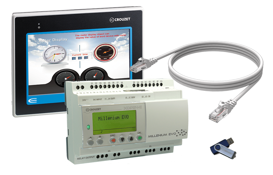 MilleniumEVO kit, smart relay with embedded ethernet XDP24-E, Crouzet touch CTP107-E performance, ethernet cable, USB key