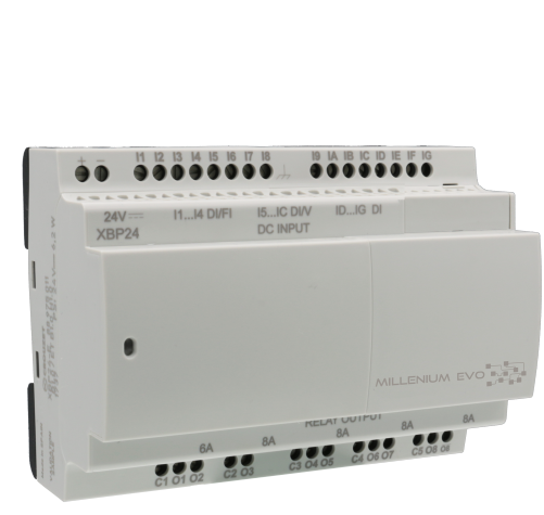 Milleniumevo smart relay, 24 VDC, 16 digital inputs (8 analog-4 high speed), 8 relays digital outputs, local datalog, free soft, mem. 1024 blocs, specific fbd, 32 bits mangement, Modbus Rs485, bluetooth/virtual display opt.