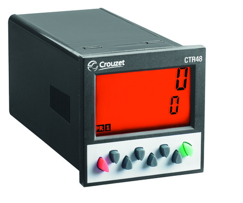 Multifunction counter CTR48 (preset, multi-totalizer, chronometer, ratemeter), 48 x 48 mm, multicoloured LCD display, 6 digits, PNP/NPN/voltage input, 1 x 5 A (changeover) + 1 x 30 mA (SSR) outputs, 10-30 VDC, 1 preset, panel mount (clip)