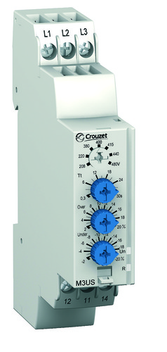 Phase monitoring relay M3US, three-phase, measuring range 183-528 VAC, 208-480 VAC, 1 C/O, 5 A, DIN Rail, 17.5 mm