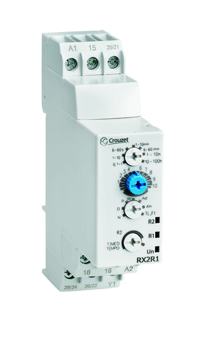 Chronos 2 relay timer RX2R1, 24 VDC / 24-240 VAC, 2 C/O, 8 A, 0.1 s - 100 h, multifunction X (Ad - Ah - N - O - P - Pt - Tl - Tt) + W, DIN Rail, 22.5 mm