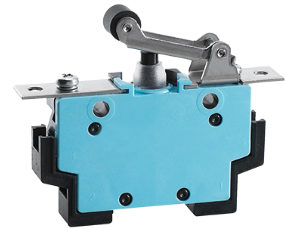 Microswitch, classique, rupture positive, série PBX-8324, force élevée 83242, action brusque, inverseur, IP40, bornes à connexion rapide 6,3x0,8, levier à galet, plaques de montage avec encoche