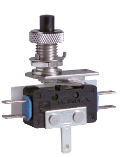 Interrupteur à commande manuelle, bouton poussoir, subminiature, action momentanée et maintenue, sortie latérale, série 83540, unipolaire 835400, action brusque, inverseur, bornes à souder